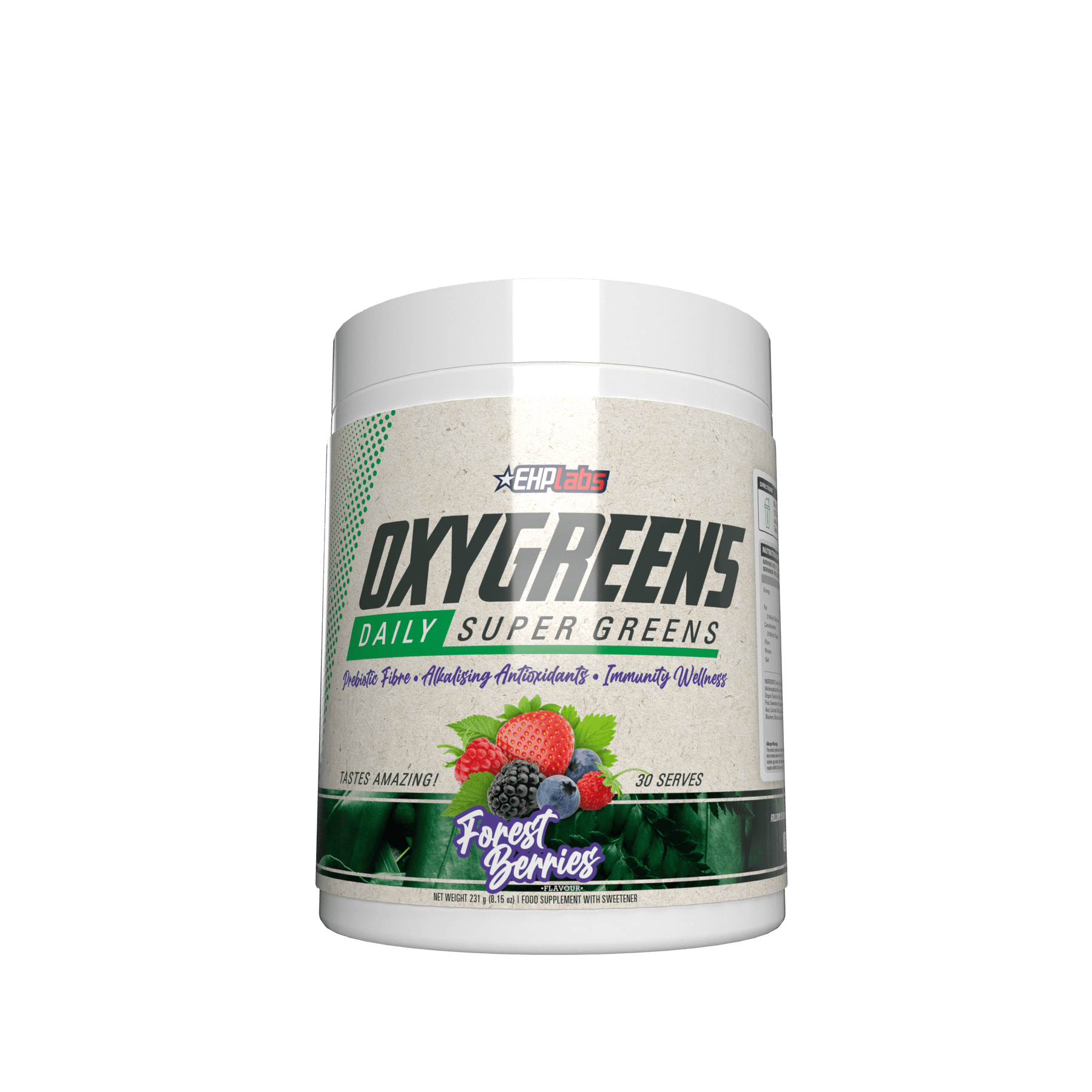 The best testing super greens powder on the market with EHP Labs OxyGreens Daily Super Greens. Enhanced with alkalizing forest berries and wholefood prebiotic fiber, this game-changing supplement delivers essential nutrients for enhanced immunity, improved digestion, and overall vitality.
