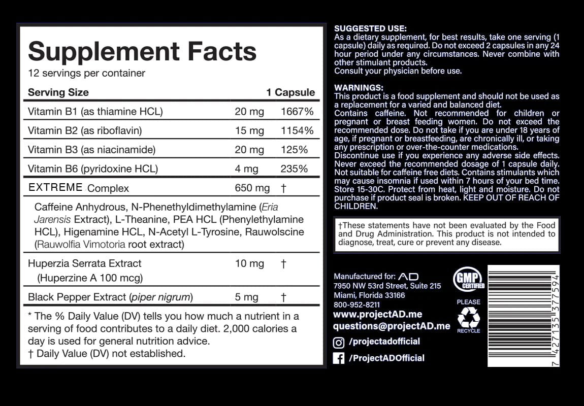 Black Energy Extreme is a unique blend of powerful ingredients that work together to provide a dynamic feeling of stimulation, focus, and energy. With four different B vitamins, 10 mg of Huperzine A, and 5 mg of black pepper extract, Black Energy Extreme is designed to give you the boost you need to conquer whatever challenges come your way. At the heart of Black Energy Extreme is our extreme complex blend of caffeine anhydrous, Eria Jarensis extract, and PEA HCL. This potent blend of stimulants provides a unique and dynamic feeling of energy and focus that you won't find in any other product on the market. Whether you're looking to power through a tough workout, stay focused during a long workday, or simply tackle your to-do list with more energy and enthusiasm, Black Energy Extreme is the solution.